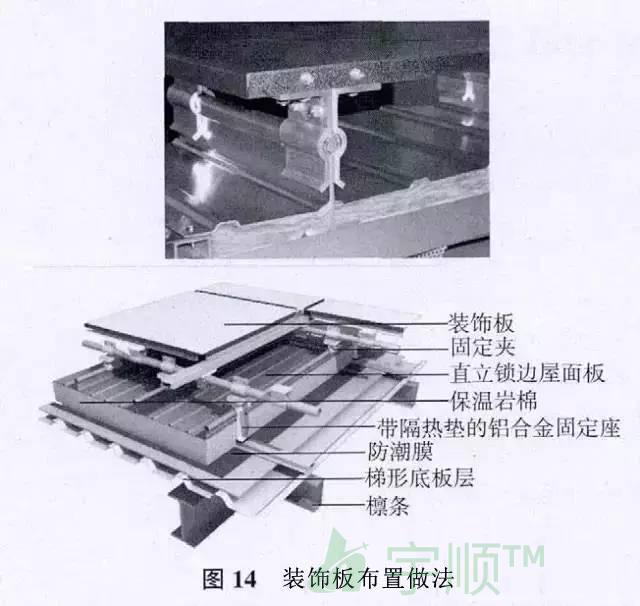 裝飾板系統的連接固定,無需在鋁鎂錳合金板上開洞;兩層板之間的開放式連接,無需維護,并可降低清理要求;可調節系統使裝飾板可完美布置,裝飾板布置做法見圖14。