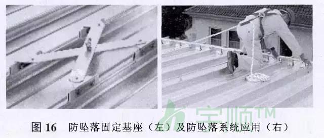 屋面的定期檢查、暴風雪后清潔屋面和天溝、屋面改造,這些都需要屋面設置防墜落系統。防墜落系統包括一個堅固、耐久且靈活的不銹鋼索,該不銹鋼索的每一端連接到屋面固定基座支架上。屋面固定基座使用鋁夾,連接到屋面板上。屋面固定基座被設計為減震器,一旦墜落發生,將變形減弱墜落的震動,并保障基座仍然安全地固定在屋面板上。